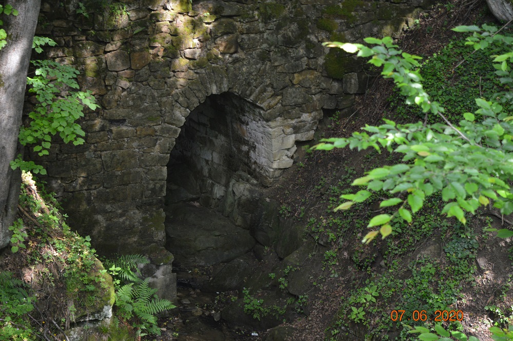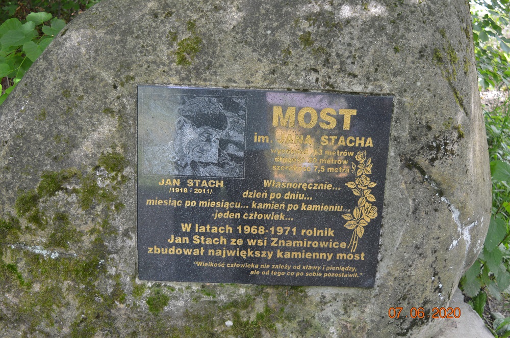Most zbudowany prze Jana Stacha w latach 70-tych XX wieku. Powodem wybudowania mostu był brak drogi dojazdowej do swojego gospodarstwa.Jedyna droga dojazdowa prowadziła przez drogę sąsiada, który zabronił Stachowi z niej korzystać. Jan Stoch znalazł wyjście z sytuacji i sam (bez pomocy sąsiadów) wybudował własną drogę o długości 500 m i skonstruował kamienny most nad głębokim jarem.Wysokość mostu wynosi 13 m., długość 20 m., a szerokość 7,8 m. i jest zbudowany z kamienia. Pod mostem znajduje się tunel sklepiony kolebkowo, a na dnie jary płynie mały potok.O Janie Stachu i jego budowli nakręcono w 1971 r. film, który sprawił, że budowla stała się atrakcją turystyczną. Województwo małopolskie