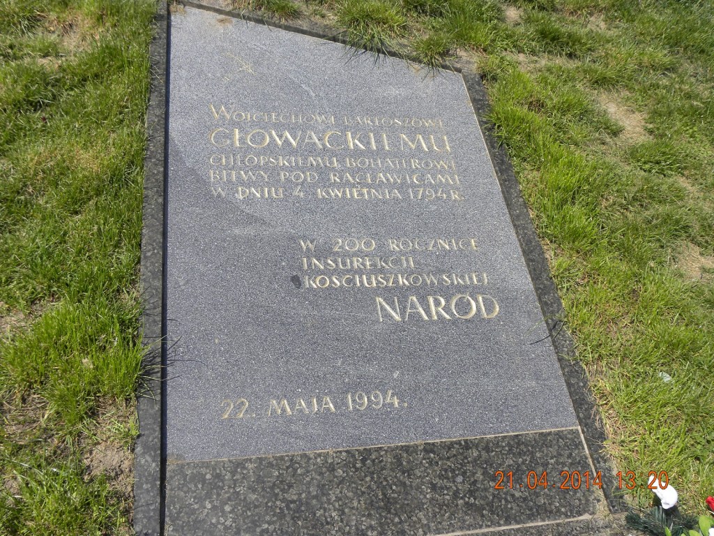 Wojciech Bartosz Głowacki był bohaterem insurekcji kościuszkowskiej.. W bitwie pod Racławicami 04.04.1794 r. w ataku na baterię rosyjską, odznaczył się męstwem i odwagą za co został mianowany przez Tadeusza Kościuszkę chorążym Grenadierów Krakowskich.Do legendy przeszedł czyn Bartosza, kiedy to czapką ugasił lont rosyjskiej armaty. Po awansowaniu na oficera zmienił nazwisko na Głowacki. Zmarł w Kielcach po odniesieniu ran w bitwie pod Szczekocinami 06.06.1794 r.Pola racławickie oraz przyległe wsie Dziemiężyce oraz Wrocimowice znaczyły mogiły poległych w bitwie kosynierów.Na polach i łąkach rozsianych było wiele mogił i krzyży mogilnych. Z czasem ślady zniknęły z pól i pamięci ludzkiej.Dlatego dla upamiętnienia poległych kosynierów w bitwie racławickiej, postawiono w wielu miejscach pamiątkowe tablice oznaczone krzyżami.W centralnym punkcie pola bitwy znajduje się 13-metrowej wysokości wzgórze, które dla upamiętnienia bitwy racławickiej i jego dowódcy nazwano Kopcem Tadeusza Kościuszki. w XIV w. na tym wzgórzu istniała rezydencja tzw. Zamczysko, które popadło w całkowitą ruinę. Wzgórze to było miejscem ważnym strategicznie w czasie trwania bitwy. Woj. małopolskie.