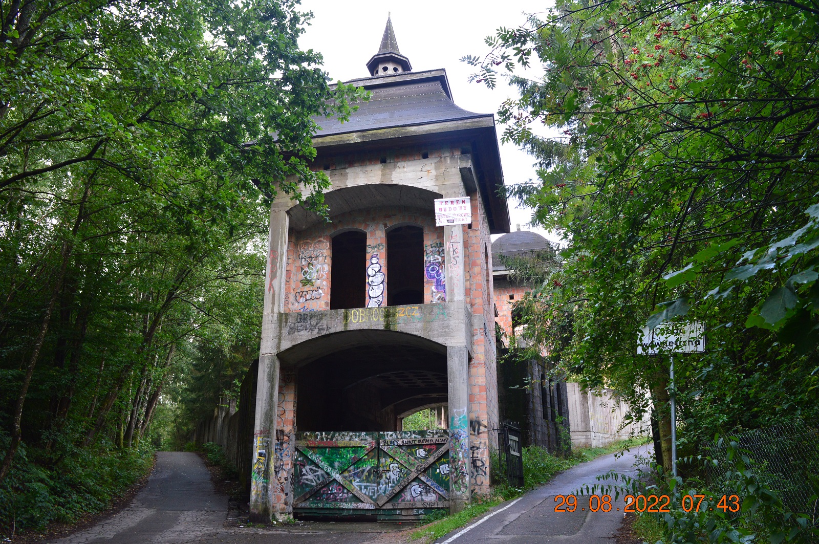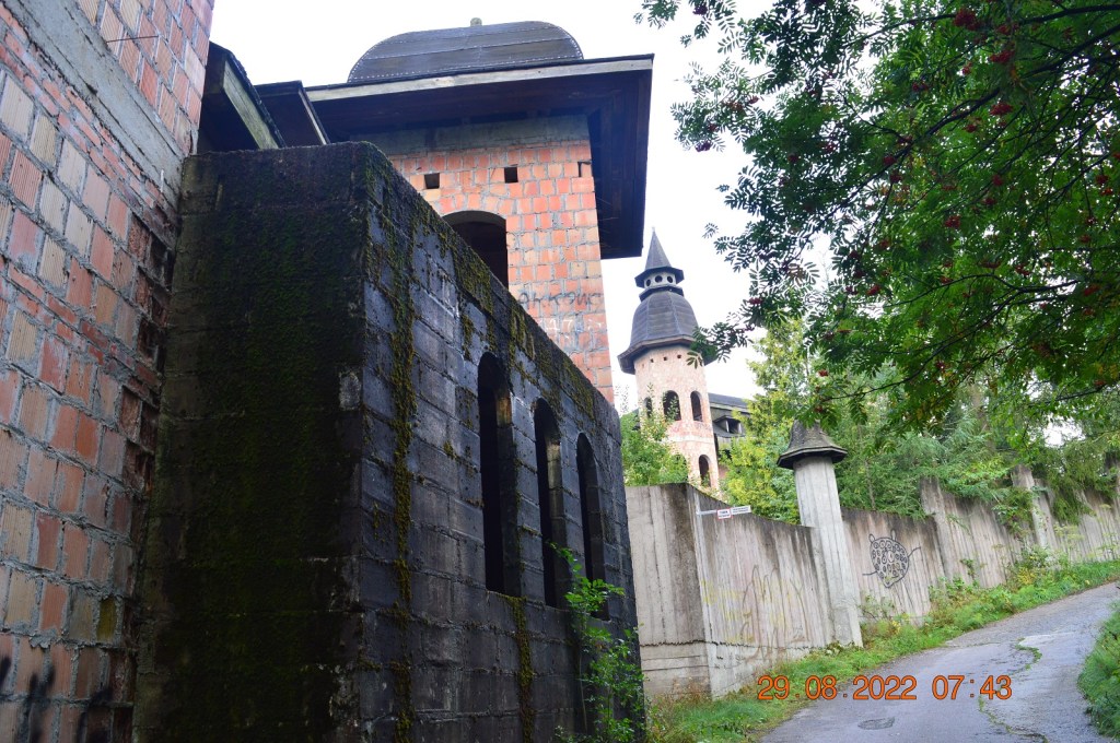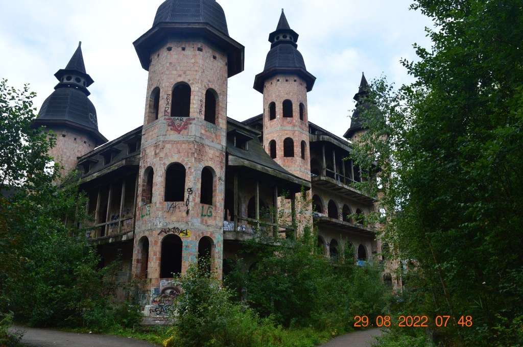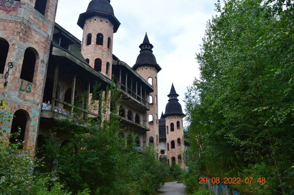 W tej niewielkiej miejscowość z inicjatywy gdańskiego przedsiębiorcy w 1979 r. na szczycie góry rozpoczęto budowę współczesnego zamkuZ powodu kłopotów finansowych prace zostały wstrzymane ale dotychczasowy wygląd budowli robi ogromne wrażenie.Na zdjęciu zamek wysoki i dolny.Na zdjęciu niecka baseny, a nad nim ala balowa.Sufity przypominają kasetony wawelskie.Pomimo niedokończonej budowli zamek przyciąga wielu turystów. Obiekt podzielony jest na zamek wysoki i zamek dolny i najeżony jest dwunastoma basztami. Wewnątrz widać labirynty korytarzy, przejść schodów, są też lochy.Cały zamek otoczony jest wysokim murem, a przejścia strzeże barbakan. ( zdjęcie ne. 1) Województwo pomorskie.